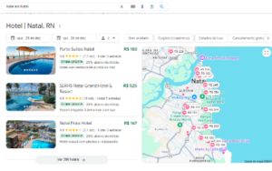 Quando o usuário pesquisa por opções de hospedagem, como “hotel em Natal”, o Google exibe inicialmente os hotéis patrocinados no topo da página, seguidos por um mapa e uma lista detalhada de várias opções de hotéis. Este é o Google Hotel Ads!